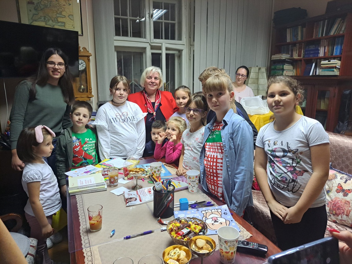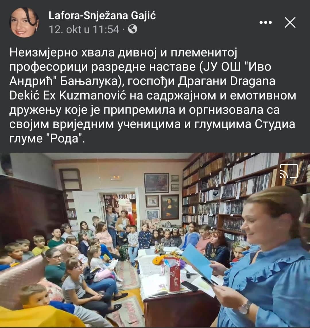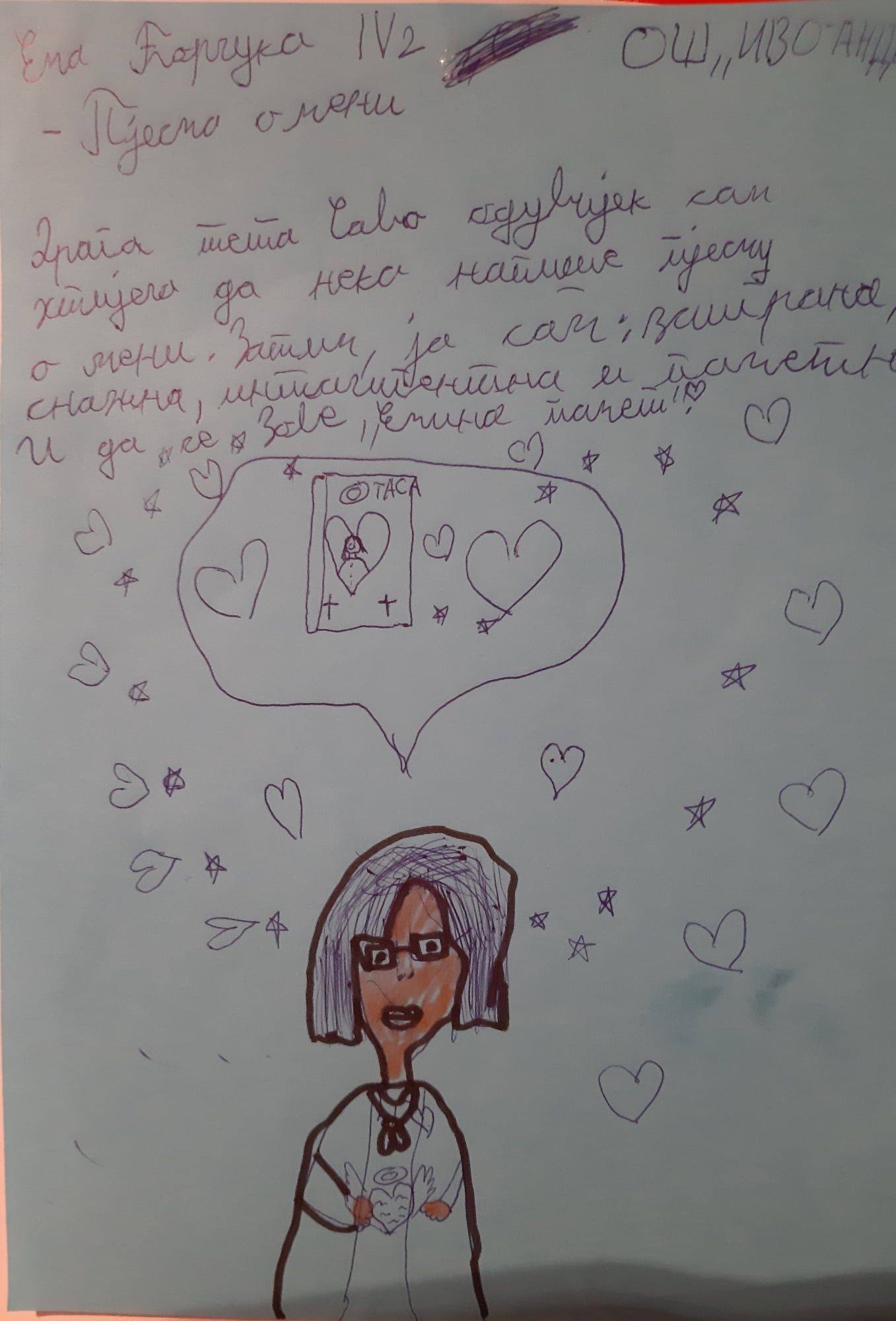 У петак, 28.10.2022.године, ученици наше школе: Ајна Бајрић, Милица Пејаковић, Данина Миодраговић, Миа Пастуовић, Катарина Марић и Ема Ћорлука су са својом учитељицом присуствовале и увеличале поетско вече које је за њих припремила наша драга књижевница Сава Гуслов Марчета. Вече је било тешко привести крају јер су молили да им чита још… Потом су дјеца читала њене приче, цртала цртеже и на табли писала своје жеље… А било је дивних, смјелих, изненађујућих жеља које су се испуниле. Наиме, ученица наше школе, Ема Ћорлука је пожељела да књижевница Сава напише пјесму о њој, која ће се звати „ Емина пјесма“. Ема је као и остала дјеца, нацртала поетесу, али и написала своју жељу.