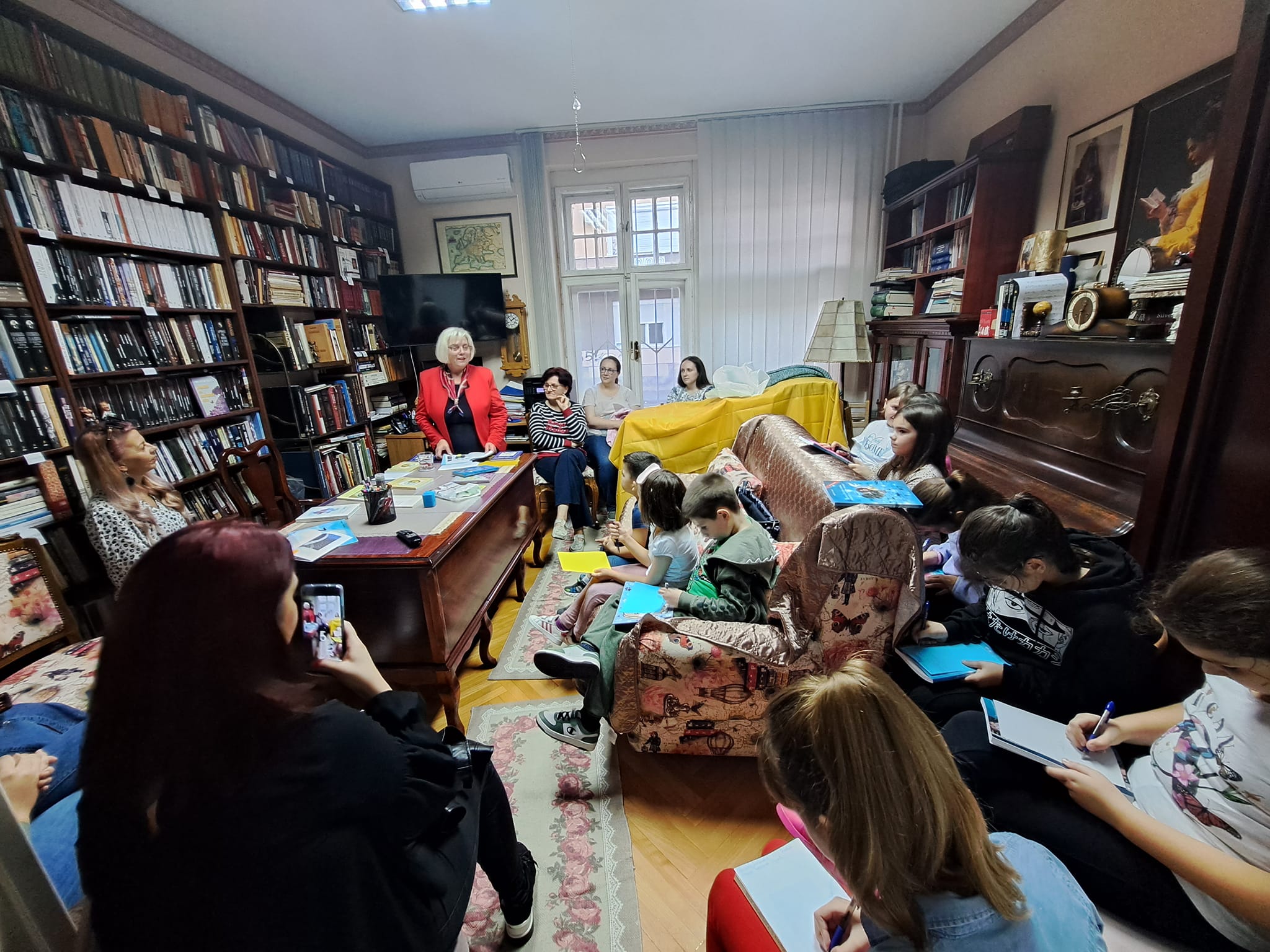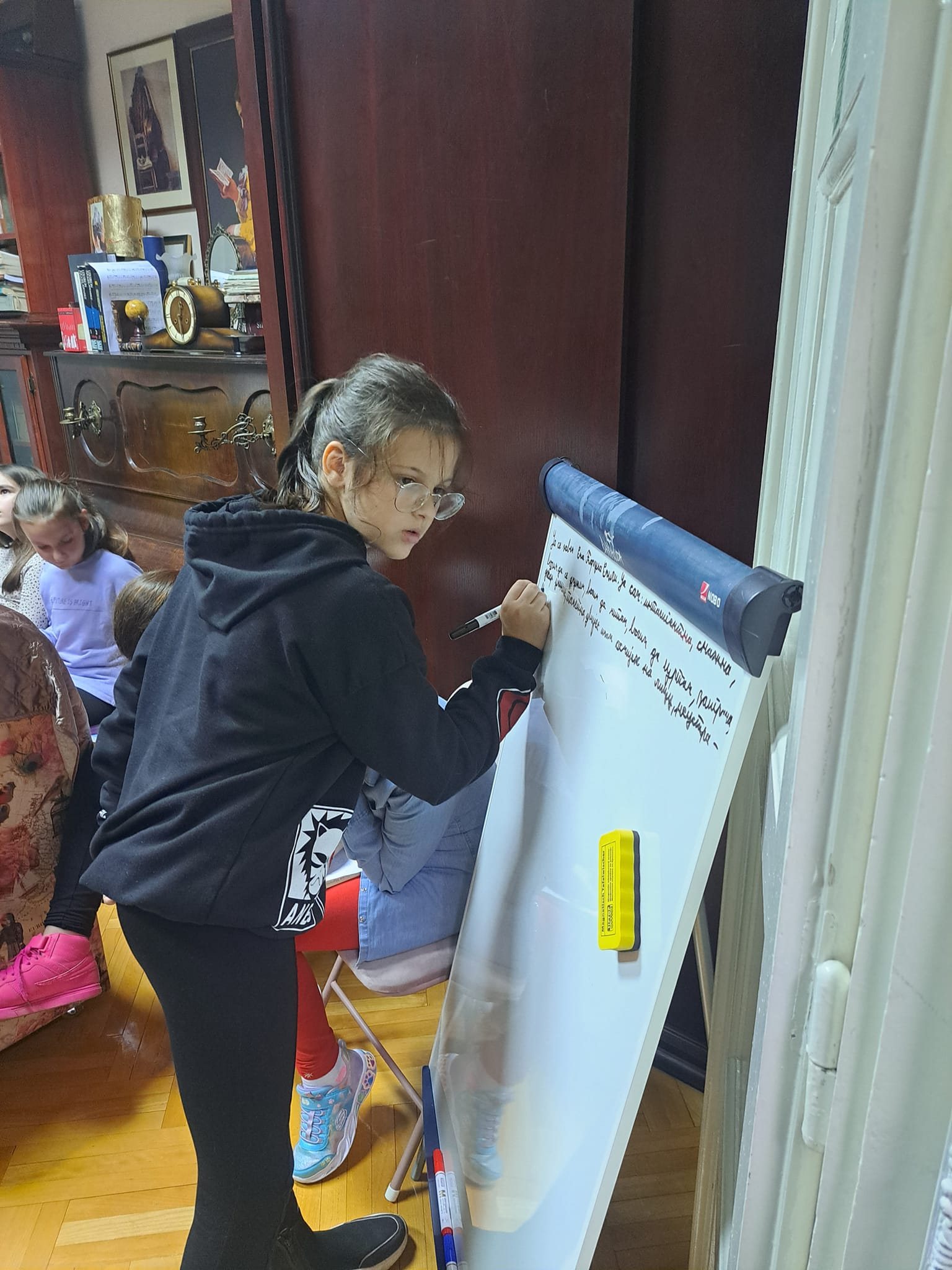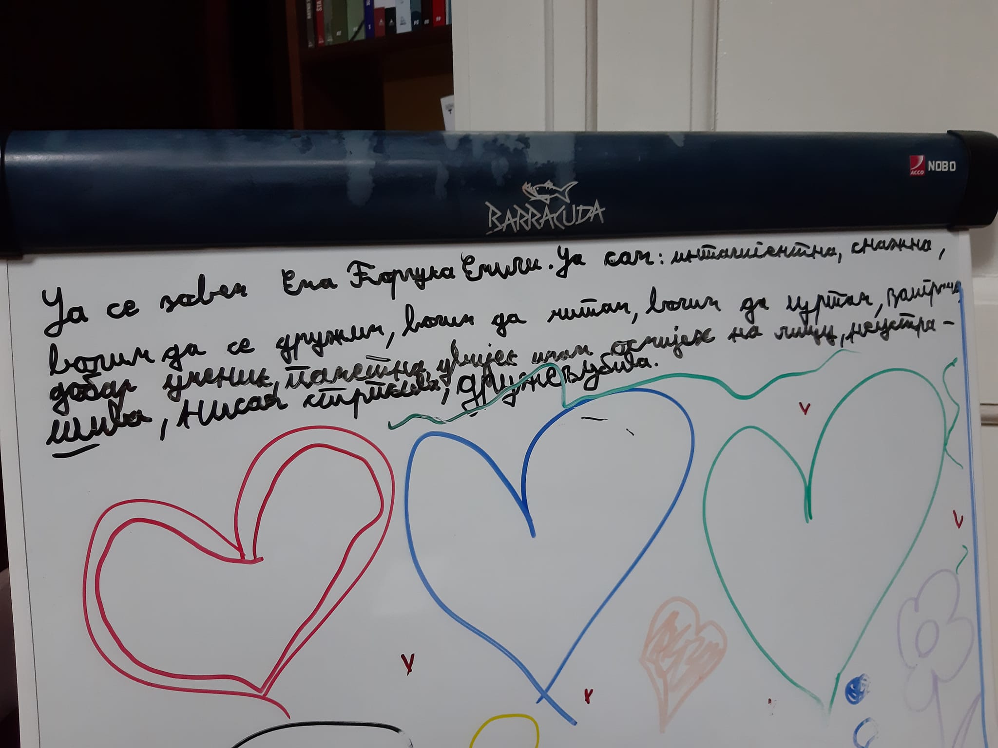 У петак, 28.10.2022.године, ученици наше школе: Ајна Бајрић, Милица Пејаковић, Данина Миодраговић, Миа Пастуовић, Катарина Марић и Ема Ћорлука су са својом учитељицом присуствовале и увеличале поетско вече које је за њих припремила наша драга књижевница Сава Гуслов Марчета. Вече је било тешко привести крају јер су молили да им чита још… Потом су дјеца читала њене приче, цртала цртеже и на табли писала своје жеље… А било је дивних, смјелих, изненађујућих жеља које су се испуниле. Наиме, ученица наше школе, Ема Ћорлука је пожељела да књижевница Сава напише пјесму о њој, која ће се звати „ Емина пјесма“. Ема је као и остала дјеца, нацртала поетесу, али и написала своју жељу.