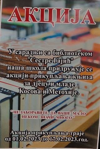 ИЗВЈЕШТАЈ ШКOЛСКЕ БИБЛИОТЕКЕ ПОВОДОМ АКЦИЈЕ ПРИКУПЉАЊА КЊИГА ЗА ДЈЕЦУ И МЛАДЕ ЉУДЕ КОСОВА И МЕТОХИЈЕ У САРАДЊИ СА БИБЛИОТЕКОМ „СЕСТРЕ ГАЈИЋ“