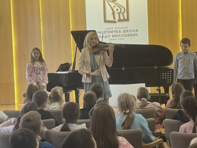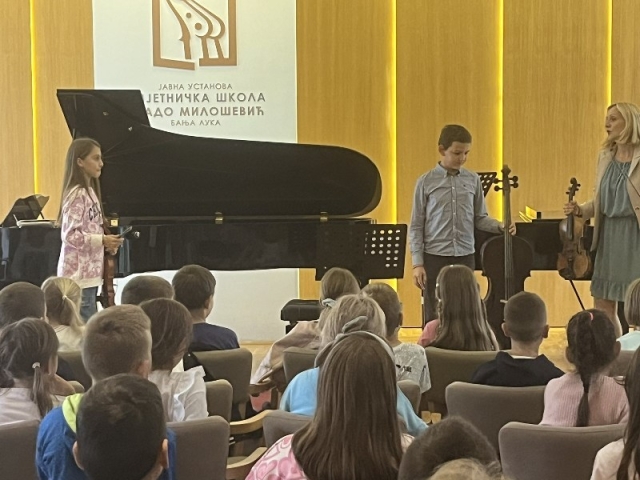 Дана 26.9.2023. године ученици III1, III2 i V3 са својим учитељицама су посјетили Музичку школу „Владо Милошевић“. Госпођа Милена Дмитровић, професор клавира, а уједно и мајка нашег ученика Јанка Дмитровића из III2 и госпођа Наталија Тодоровић, магистар виолине и мајка наших ученика Јована Тодоровића из III1 и Милана Тодоровића из V3 су упознале ученике са начином рада у музичкој школи и представиле неке музичке инструменте. Ђаци који похађају ову установу су одржали мали концерт. Било је поучно и забавно. Сарадња родитеља и школе је веома важна у васпитању и образовању наших ђака.