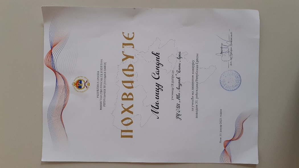 Ученица Милица Сандић из одјељења IX-2 је похваљена за рад „ Музеј Савремене умјетности“.