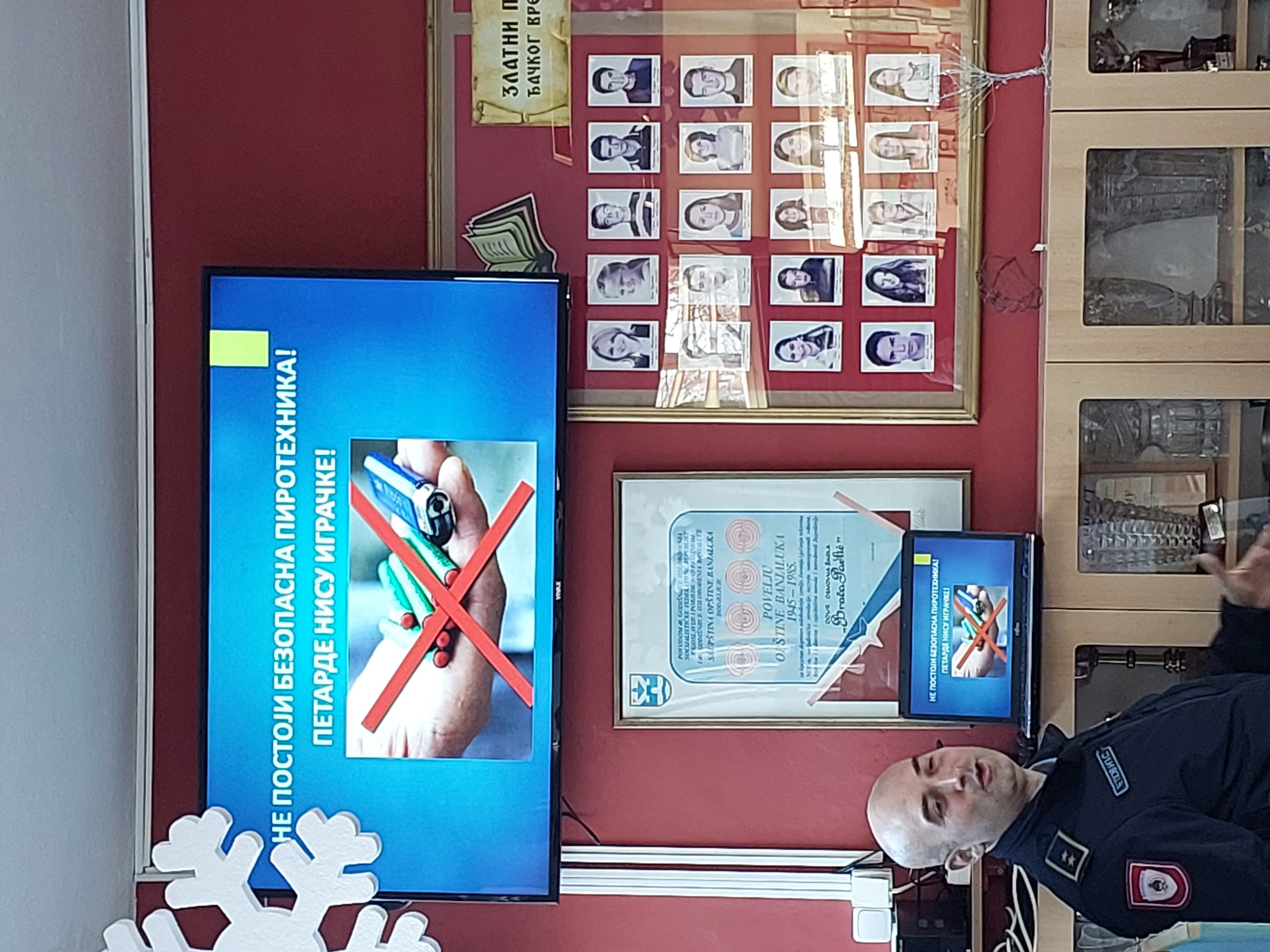 Обзиром да се ближе новогодишњи и божићни празници и како би они протекли у миру и без нежељених последица ученицима I1, I2, I3 и I4 разреда од стране Полицијске управе града Бања Луке одржано је у холу наше школе 18.12. 2023. године предавање на тему: НЕ ПОСТОЈИ БЕЗОПАСНА ПИРОТЕХНИКА.