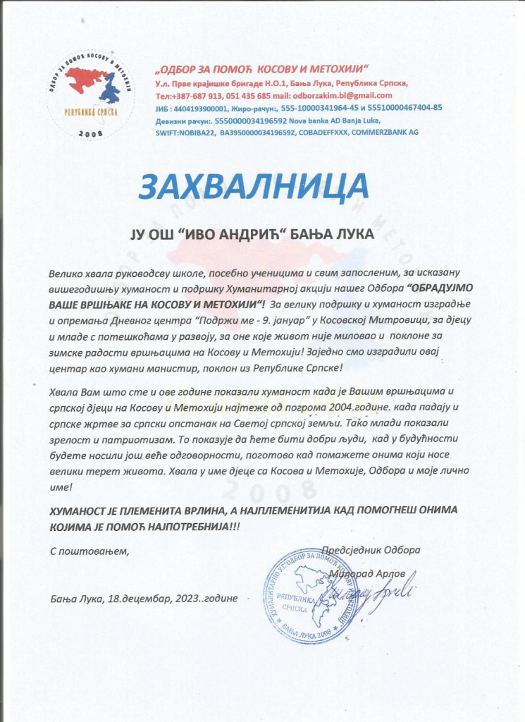 У периоду од 4. 12. до 8. 12. 2023. године реализована је хуманитарна акција под називом „ Обрадујмо наше вршњаке на Косову и Метохији“. Прикупљена новчана средства ће се употријебити за куповину поклон пакетића за дјецуи младе са потешкоћама у развоју, дјецу из вишечланих породица и на тај начин послали смо им нашу велику подршку, љубав и бригу за њих. Хуманост је племенита врлина, поготово када помажемо ономе коме је помоћ потребна и не очекујемо да нам се материјално врати!!! Хуманост наших родитеља, ученика и наставника је сваке године била за примјер свима нама. Овом приликом захваљујемо се нашим родитељима, ученицима и одјељењским старјешинама јер су и овог пута као и безброј пута раније показали да имају велико срце, душу и доброту.