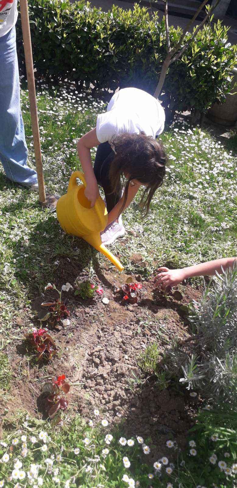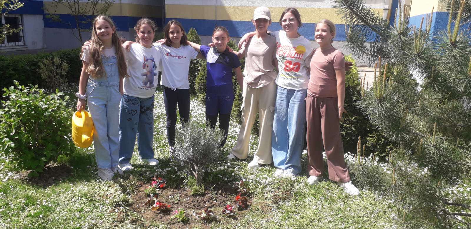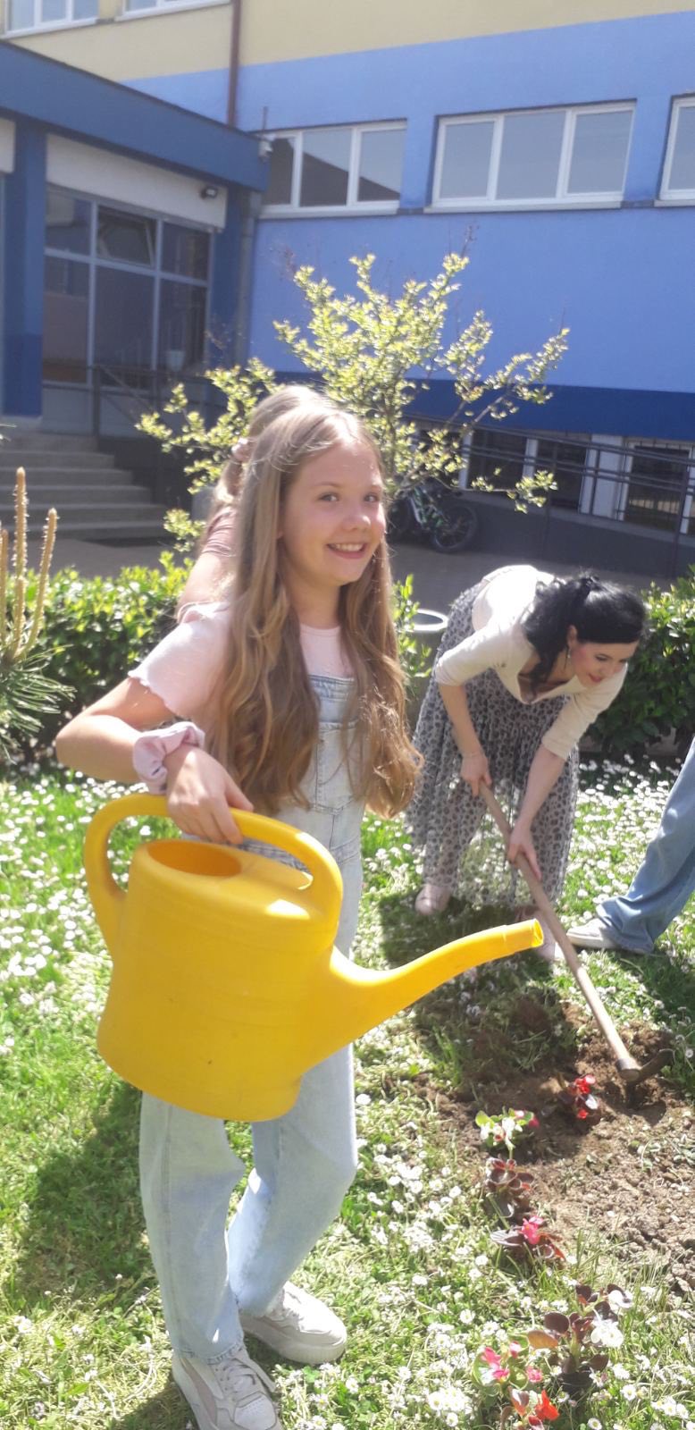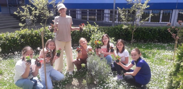 Ученици одјељења V3 са својом учитељицом Вањом Бањац Сердар су пажљиво одабрали и припремили саднице и посадили цвијеће у школско дворише и тако допринијели уређењу наше школе.