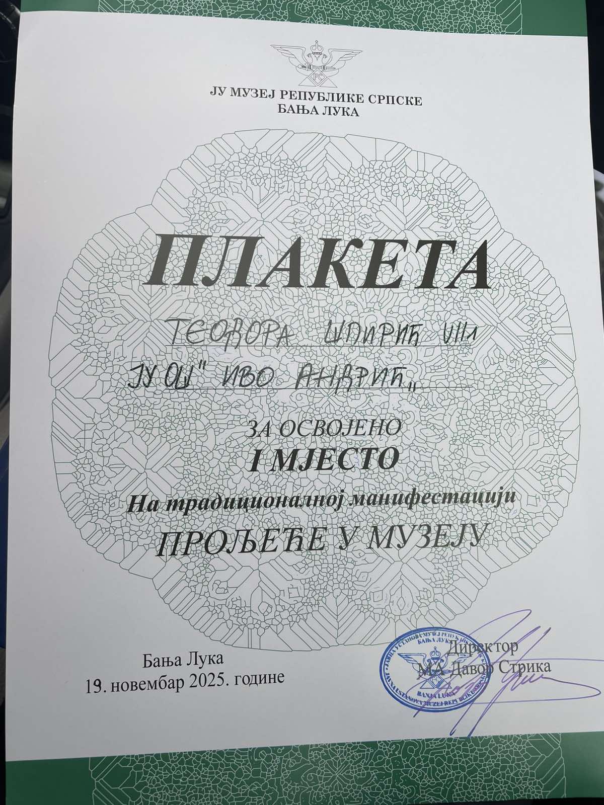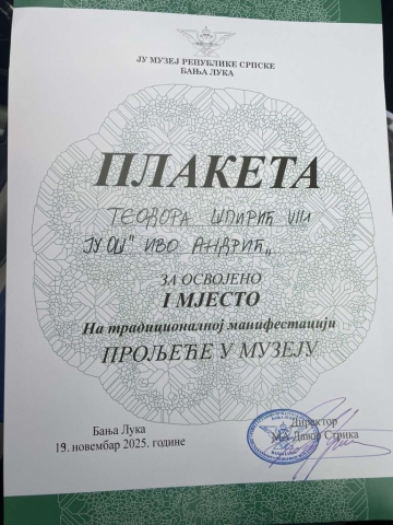 Наша ученица, Теодора Шпирић из одјељења 7-1 је освојила 1 мјесто у категорији шестих и седмих разреда. Честитамо Теодори на успјеху!